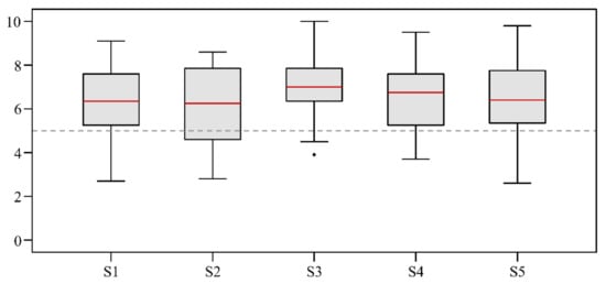 The subjective evaluation for ‘ride’ showed the best rating for S3, with a median of 7.00 (3.90–10.00), and the lowest rating for S2, with a median of 6.25 (2.80–8.60). The ANOVA revealed no significant mean effect (p = 0.263) between the ratings for ‘ride’ (Figure 4).