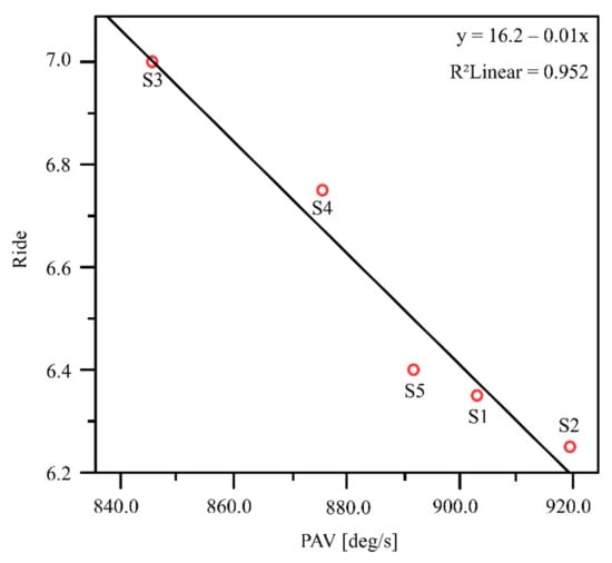 The regression analysis revealed a significant interaction between PAV and ‘ride’ (F = 59.479; p = 0.005). Thus, PAV seems to have an impact on ‘ride’. As shown in Figure 5, a negative correlation (r = −0.976) was found between PAV and ‘ride’. The effect size showed a strong effect (f = 4.45).