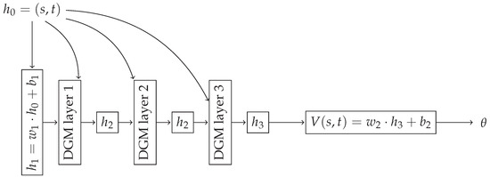 DGM approximates using a deep neural network (DNN), whose inputs are the state vector s and the scalar t. By means of using the backpropagation algorithm, it is possible to obtain the exact gradients and . The DGM takes advantage of this to approximate the PDE using batches of samples: given the state and time space, we sample two sets of points: a set of interior points that belong to the interior of the state and time space and a set of terminal points . The set of interior points is used to minimize the following training loss: