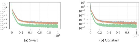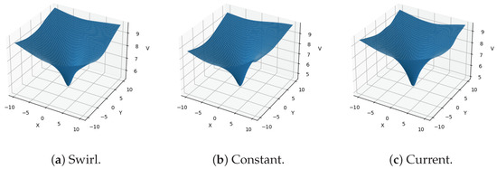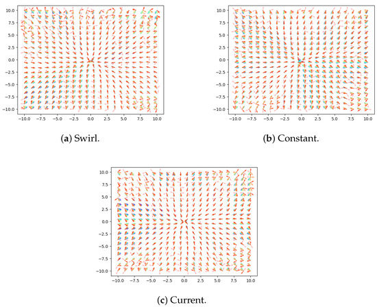 As disturbances, we used the three models introduced in Section 2.2: a constant field disturbance following (2), with parameters ; a swirl following (3), with parameters ; and a current following (4), with parameters .
