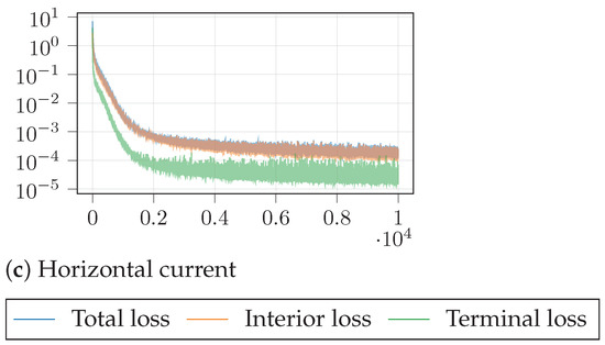 Training losses of DGM for the surrogated OCP solution (13): the horizontal axis represents the training epoch, while the vertical axis represents the losses (lower is better). We represent the total loss, which is the sum of the interior loss (8) and the terminal loss (9): as the latter is around one order of magnitude smaller than the former, the total loss is dominated by the interior loss. Note how all losses are minimized as the training advances, which means that DGM converges to a solution of the HJB equation.