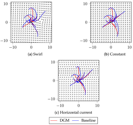 Finally, in Figure 5, we plot several trajectories for each disturbance and control law. Observe that the subtle differences in controls between the baseline (17) and the control obtained by DGM (see Figure 4) are translated into significant differences in terms of trajectories, and hence, in costs. DGM is able to adapt to the disturbance, and specially in regions where the effect of the disturbance is strong, as close to the swirl or current centers, its advantage over the baseline is clearly seen, as it is able to obtain a control law that minimizes the time to reach the origin. As we mentioned, in regions where the disturbance effect is small, the baseline control is good, and the DGM provides similar values to it.
