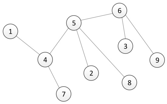 Assume that in the considered multi-agent system, there exists two different types of communication interfaces. Let A and B be adjacency matrices of the graphs for each communication channel, where the matrices’ elements are estimated using a trust-based consensus algorithm described in Section 3. In the rest of this section, we propose a method for combining different types of communication channels. For the sake of clarity, we have introduced our method using a system of nine agents with two physical channels, but it is not limited to that number of agents. Assume that communication protocols, denoted as A and B, are represented with a graph’s topologies shown in Figure 1 and Figure 2, respectively. Since each communication channel has a different topology, the question is how to construct a communication network by combining links from different channels. The resulting network, whose adjacency matrix is denoted by T, should include links with better quality among the available channels.