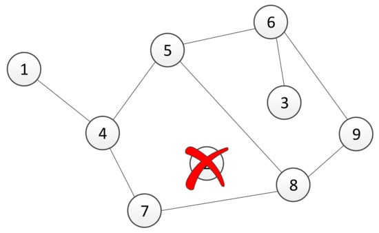 In this section, we will study the robustness of the used algebraic connectivity estimation algorithm under perturbations in the number of agents in the system. In a real multi-agent system, a loss of communication with one or more agents is typically caused due to the failure of an agent. When a decentralized trust-based consensus algorithm for the estimation of the algebraic connectivity of the communication network, described in Section 3, has been used, a failure or connectivity loss with a single agent causes an inability to control the connectivity of the remaining network. If the agents that are still operating calculate the algebraic connectivity using a fixed number of agents in the network, usually determined with an initial condition, then they are unable to increase its value. Specifically, in the case of agent failure, the graph’s adjacency matrix elements that represent its links are equal to zero. Thus, the corresponding Laplacian matrix has a zero row, and its second smallest eigenvalue is equal to zero as well. In order to overcome this problem, we present an algorithm that dynamically resizes a group of collaboration agents and ensures that the connectivity of agents with acceptable performance remains at a certain level. Basically, we have two possible cases here. The first case is when the performance of agents becomes too poor (Figure 3). In this case, the agent is affecting the system’s performance. Therefore, the algorithm should detect the critical agent and remove it from the group. The second case includes the moment when a new agent is added to the group (Figure 4). Without the loss of generality, the presented scenarios for removing and adding an agent are described using a system with nine agents. The size of the system is chosen because the effects of variation in group size can be easily formally written. Furthermore, the algorithms are written in a general form that allow for their implementation on any agent in the group of n agents.