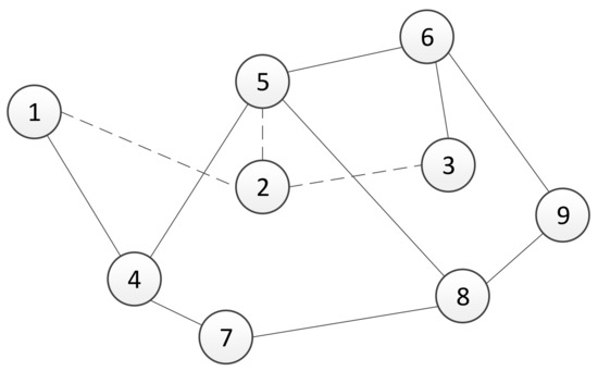 In Figure 4, a network topology of the multi-agent system with nine agents is presented, where agent 2 is added to a group of eight agents. Dashed lines represent links established by agent 2 before sending an adding request. Therefore, agent 2’s set of neighbours is equal to .
