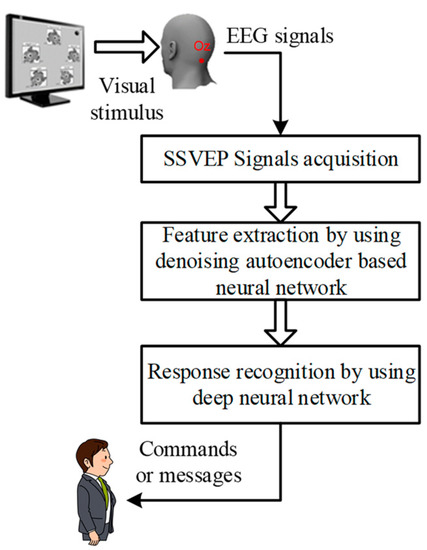 The flowchart of feature extraction by using denoising autoencoder-based neural networks is presented in Figure 2. An acquired EEG signal x(t) is the sum of an ideal SSVEP signal, s(t), and a noise signal n(t) and it can be written as