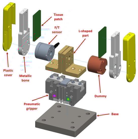 As in Figure 2, the F/T sensor was interfaced on one side to a L-shaped part which was mounted directly above the gripper right jaw. On the other side, the F/T was connected to another part acting as a finger. Such a finger was composed by an inner, metallic core (i.e., bone) and by a plastic cover facing outwards. A soft tissue patch made of Neoprene was instead attached on the internal face of the finger.