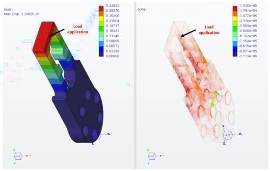 Results of the FEM analysis on the metallic finger simulating the application of a 100-N load on the top. On the right, the principal stresses are shown, whereas on the left, the structure displacement is depicted. The software used for the simulations was Creo Parametric.