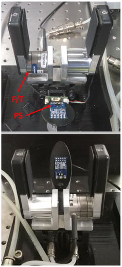In addition to the gripper prototype, the experimental setup includes a PS located on a dedicated support, as illustrated in Figure 4. The PS support was 3D-printed as well. In the current setup, which constitutes our first attempt to provide a pneumatic gripper with multiple sensors information, the PS was not integrated but was rather located externally. We are developing a fully integrated pneumatic gripper prototype embedding more PSs without external supports. Such an integrated prototype will be presented in future works, as is also reported in the Conclusion.