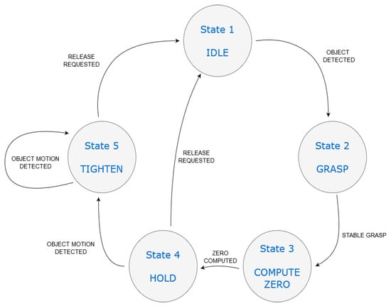 - State 1—IDLE. The gripper fingers are open and no operation is performed. The PS constantly monitors the grasping area to detect objects to be grasped;