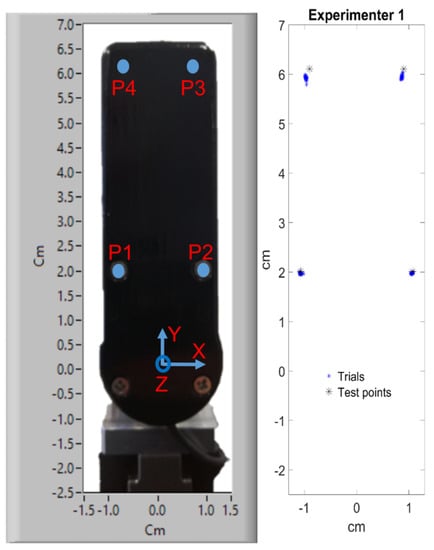 Before proceeding with the gripper performance assessment, the validation of the CoP estimation will be shown. Two experiments were performed by as many operators as possible (namely Exp1 and Exp2), during which four predefined points were manually pressed by means of a thin probe. Each point was pressed 10 times. The finger cover was removed and the experiments were performed on the inner metallic structure, where the points were easily recognizable (see Figure 7).