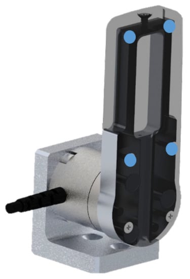 Now, such a gripper came without fingers and sensors of any kind. Therefore, we created our prototype (Figure 2, exploded view) by mounting some 3D-designed parts and some off-the-shelf sensors. A similar prototype proved to be ideal for testing and validating the smart functionalities mentioned in the Introduction by means of the algorithm that will be presented later.