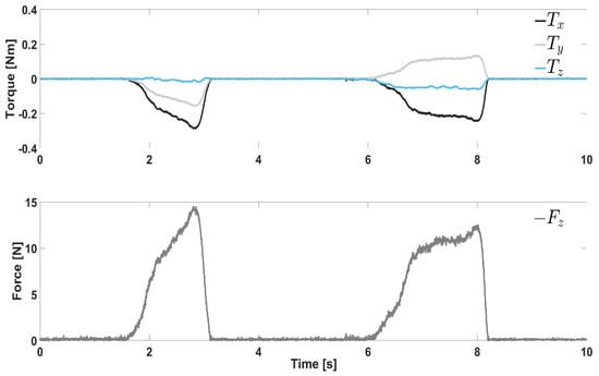 First, we validated the formulas used to estimate the CoP, i.e., Equation (1). Figure 9 plots the measured torques and the force when the operator applied a pressure with the aforementioned probe on P1 and P2 (according to Figure 6). Clearly, the torque always has the same sign, i.e., negative, as both the application points P1 and P2 are above the F/T sensor reference frame. Therefore, it is convenient to use the negative value to achieve a positive coordinate . On the other hand, the torque changes sign depending on where the pressure is exerted. Specifically, P1 and P2 are located on opposite sides w.r.t. the reference frame origin, yielding negative (P1) and positive (P2) values. As a consequence, the sign of must be taken into account when computing , avoiding to adopt the torque absolute value. In this way, the coordinate will have a correct sign, being positive for P1 and a negative for P2. According to Equation (1), very little force Fz will generate uncertainty. To eliminate such uncertainty, both and were set to be null whenever the grasping force Fz was lower than 1 N.