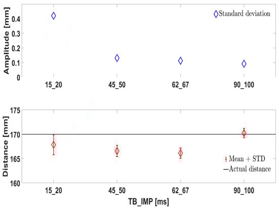 From Figure 11, when and are too short, i.e., ms and ms, the SD of the PS measurement is too high (top subplot). This leads to low accuracy and introduces measurement uncertainty. On the other hand, a of at least 45 ms drastically reduces the SD. That is, a frequency of 20 Hz is the maximum achievable ( ms) in order to have a good performance. From the bottom subplot, one can see that the best performance in terms of measurement precision is given with the highest and tested. Hence, the couple ms and ms was selected. Notice that the distance of 170 mm is recommended by the manufacturer to be used during calibration.