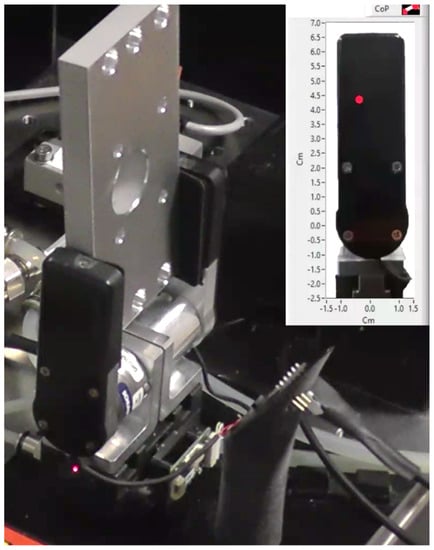 Figure 12 illustrates the setup during an experiment with the holed metal piece. The state machine was in the HOLD state, maintaining the piece between the fingers and waiting to move either to the TIGHTEN state, in case of movement detection, or else to the IDLE state if the gripper was commanded to reopen. The objects were randomly placed by the human operator between the fingers, in a collaborative fashion, without caring to match a precise grasping position. From the figure, one can see that the metal piece is not exactly aligned along the Y axis; the resulting CoP is located correspondingly. Since the system is in HOLD state, the red dot represents zero. With no perturbation, the grasping operation terminates and the gripper reopens (IDLE). Otherwise, if , the TIGHTEN state will be entered. A very small disturbance applied by the operator hand is sufficient to induce the system response.