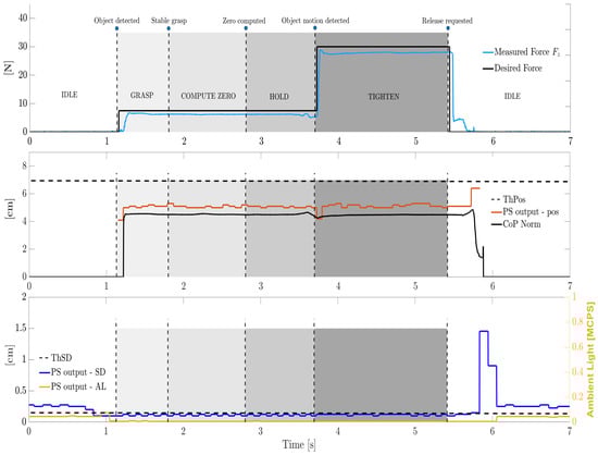 As the object approaches the gripper fingers, AL and SD drop below the thresholds and , resulting in a valid measurement of pos. This means that the gripper is ready to pass from the IDLE state to the GRASP state. The fingers close as the desired force reaches the first level N, typical of the OBJECT DETECTED transition.
