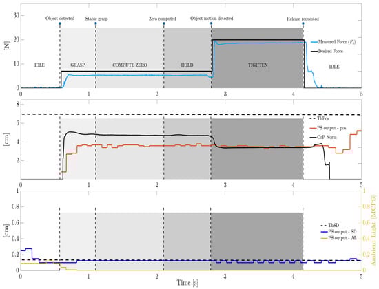 Consider, e.g., Figure 13: until 1 s, both grasping force and the CoP are null, i.e., the gripper is in IDLE state. This can be seen in the first two subplots. In the bottom one, SD and AL are still high, i.e., above their thresholds (not shown). The distance pos fluctuates too much and is regarded as a NaN, where AL and SD not adequate.