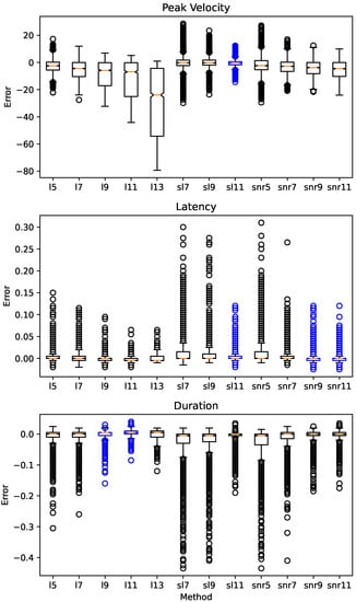 Table 2 shows that for the saccadic peak velocity, the Super Lanczos Method with 11 points is the most fit for the task. This could mean that sl11 can maintain the better waveform of the differentiated signal around the point of maximal velocity (middle of the saccade). Further study is required.
