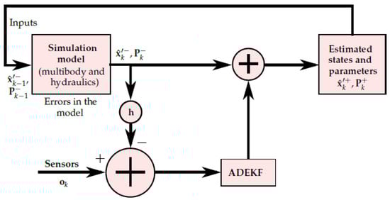In the real world, the sensors shown in the Figure 1 can be replaced by sensor measurements obtained from a physical system, such as a forklift, a tractor, etc. [4,57]. To account for the system response, the sensor measurement vector includes the minimum number of measurements required by the ADEKF algorithm to estimate the states and parameters of a real system. In Figure 1, corresponds to the sensor measurement function. Note that the parameters should not be included in the measurement vector, i.e., . The parameter estimation algorithm estimates the augmented state vector and covariance matrix from the minimum information of the real system at time step in the simulation model.