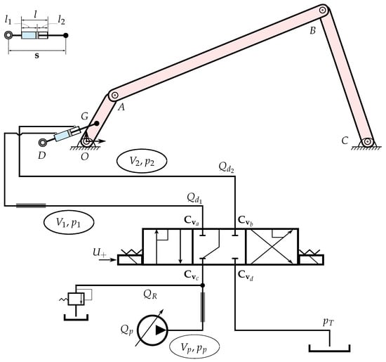 where and are the flow rates in the control volumes 1 and 2. In Equation (32), and are the pump flow rate and flow rate through the pressure relief valve, respectively. The flow rates , , and can be computed by employing Equations (9) and (10), respectively. The constant hydraulic parameters are tabulated in Table 1. In Equation (32), is the actuator velocity, which can be determined from the actuator position vector . Following Figure 2, the vector can be calculated from the position vectors and as