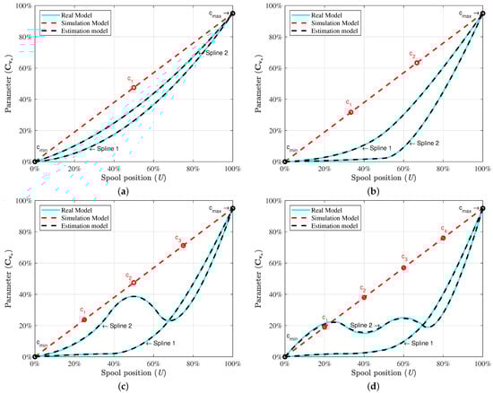 Figure 3b shows the estimation of the characteristic curve when using four points , , , and . As can be seen in Figure 3b, the semi-empiric flow rate coefficient for Spline 2 changes with small increments until opening of the spool as compared to Spline1 in the real model. After this point, the parameter increases sharply towards the maximum point . The difference of the estimated curve from the real model’s curve is indistinguishable. The RMSEs of these curves are given in Table 3. The relatively complicated non-linear behaviours of the directional control valve can be estimated by using five control points and six control points. This can be seen in Figure 3c,d. By using the estimated characteristic curves, the working conditions of the directional control valve can be predicted.