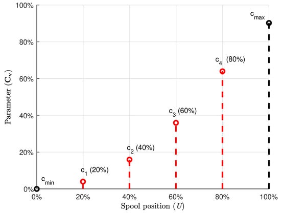 where n is the number of control points, d is the degree, are the dth order of B-spline basis functions, and is the control point vector. The control point vector can be expressed in terms of the system parameters . For instance, in the case of the characteristic curve, the control point vector can be written in terms of the spool position and semi-empiric flow rate coefficient as . Here, , and represent spool positions, and , and are the semi-empiric flow rate coefficients of a hydraulic valve. can be defined by using the Cox–de Boor recursion formula [48,49]: