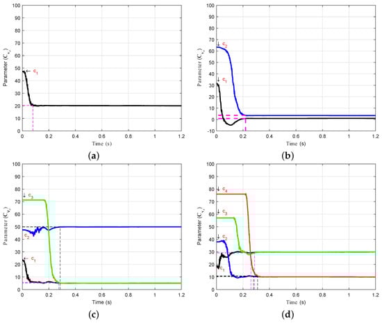 where s is the actuator position, is the actuator velocity, , , and are the pressures, is the pressure flow coefficient, is the flow gain, and are the semi-empiric flow rate coefficients at the corresponding ports of the directional control valve. In Equation (37), and present the states and the parameters of the hydraulically driven four-bar mechanism, respectively. Equations (20)–(28) are implemented to estimate the augmented state vector and the characteristic curves of the directional control valve. In this application, the third-order B-spline interpolation method is combined with the ADEKF. For the case example, three, four, five, and six control points are used in the parameter estimation algorithm to compute Equations (20) and (24). As mentioned earlier, the first, third, and fourth state variables are measured. Therefore, the sensor measurement function and its Jacobian can be written as