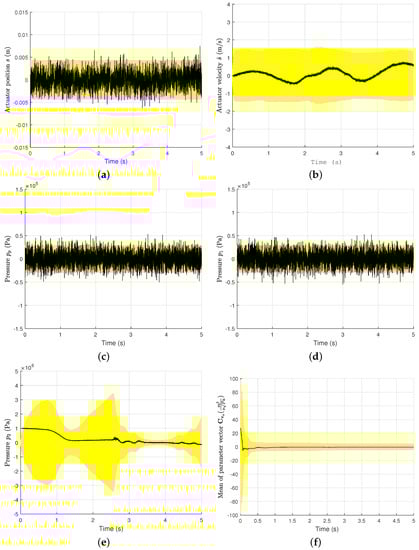 In this study, the measurable observations are taken from the real model. In the real model, the actuator position sensor measures the actuator position s [76]. Gauge pressure sensors are used for the pressure measurements and [34]. These pressure sensors measure the pressure with respect to the atmospheric pressure. The pressure sensors are installed on their respective volumes, as also shown in Figure 2. The numerical values of the standard deviation, as mentioned in Equation (29), are taken as and Pa for the actuator and pressure sensors, respectively.