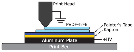 The plate was covered in a base layer of Kapton tape and a top layer of painter’s tape. Kapton tape was selected due to its excellent dielectric properties (1 mil thick, rated at 8 kV mil), which helped to prevent electrical fault during printing. To also help avoid electrical fault, the voltage was only applied when printing the second layer of the sample. The painter’s tape (5.4 mil thick) helped provide good adhesion between the printed layer and the plate, which was especially important due to the nonstick nature of Kapton tape. It should be noted that, even with the combination of Kapton tape and painter’s tape, samples could not be reliably printed at voltages greater than 8 kV with an initial layer height of 0.15 mm due to dielectric breakdown. A diagram of the setup is shown in Figure 4.