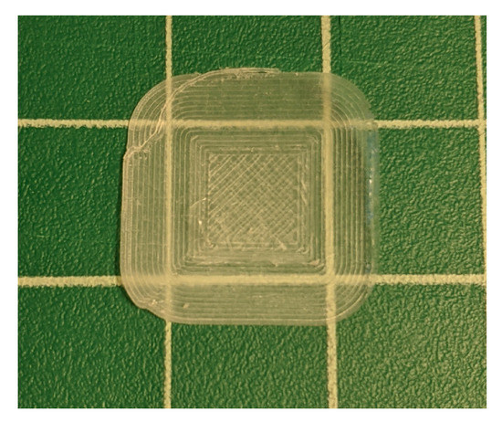 We started with single-element, two-layer prints of PVDF-TrFE, as seen in Figure 5. The CAD model was 1 cm by 1 cm by 0.25 mm with respect to the length, width, and height. The model was sliced in Cura 3.3.1 with the first layer height set to 0.15 mm and the second set to 0.1 mm. The print speed was set to 5 mm s. The extruder temperature was set to 210 °C, and the print bed was unheated. Voltage was applied only during the second layer of the print (90 s), to minimize the chance of dielectric breakdown. A sample is shown in Figure 5. The samples were printed at an ambient air temperature of 21–24 °C and between 60 and 65% humidity. Samples were painted on both sides with silver paint from Ted Pella (Product #16062) to serve as electrodes.