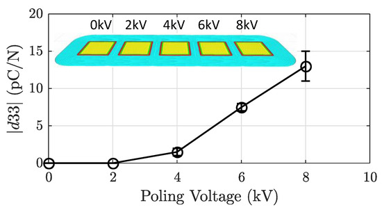 In Figure 7, the results of a multi-element printed sample are displayed. By increasing the voltage applied to the aluminum plate during the printing process, the d performance increased between the different sections of the sample. The voltage was increased in 2 kV increments between each element, spanning from 0 kV to 8 kV. The d results show that the sample was responsive to tuning the poling field strength even with close sample placement.