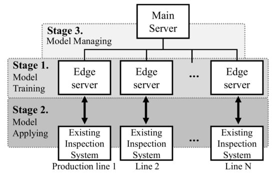 In this work, we efficiently handle all issues based on our knowledge and experience in the real manufacturing field. We aim to build a framework for automatic product inspection based on deep learning techniques and the overall proposed system hierarchy is shown in Figure 1. Edge servers are assigned for each production line and a main server manages each edge server. There are three main stages for applying deep learning to the product inspection system: (1) model training stage, (2) model applying stage, and (3) model managing stage.