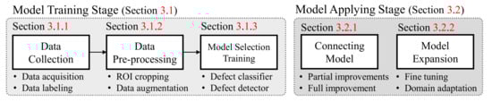 In this section, we explain the overall process of the proposed product inspection system. We categorize the proposed process into three main stages: (1) the deep learning model training stage in Section 3.1; (2) deep learning model applying stage in Section 3.2; and the deep learning model managing stage in Section 3.3. The overall processes of the first and second stages are summarized in Figure 2.