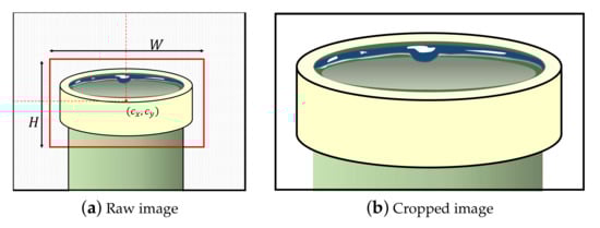 • ROI cropping. Many defect inspection systems contain conveyor belts to transport products and contain many jigs for fixing products to examine their qualities. In general, they consistently fix the products and capture the product images. We call the initial product image the raw image. However, the raw image may include an unnecessary background depending on the inspection system, as shown in Figure 3a. In this case, we need to set the region of interest (ROI) of the manufactured product. The ROI denotes the boundaries of the product in the raw image. We usually set the center position (, ) and size (H, W) of the product. Then, ROI can be represented as .