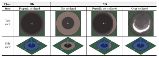 Adhesive bonding is a process in which a classification algorithm can be applied. Bond is applied to combine two parts and visual inspection is mostly carried out in this process. The errors that occur in this process include over-gluing, insufficient gluing, air bubbles, and slipping []. The classification algorithm is more favorable to this process than the detection algorithm, unless the bonding area is wide. This is not only because the inspection duration of classification is normally shorter than detection, but it is also important to see the overall shape of a part for certain types of defects.
