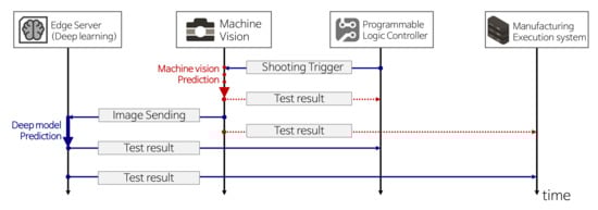 Second, for the complete replacement of the old machine vision system (goal 3), the connection scheme only requires blue arrows in the flowchart in Figure 6. Compared with goals 1 and 2, it is much simpler because it does not consider the prediction results of the old machine vision system, which does not carry out inspection and only records product images to send them to the edge server. Then, the deep learning model inspects the products and sends the results to the PLC and MES. In order to communicate between different systems, we designed a simple socket program in the C# language based on TCP/IP protocols. All terminology used in the flowcharts is summarized in Table 3.