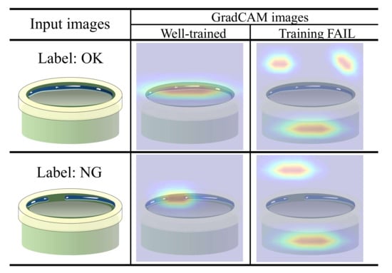 Grad-cam [] provides visual explanations from deep networks and highlights the important regions in the image for predicting the labels. Therefore, managers with no deep learning knowledge can easily analyze the Grad-cam results. Figure 7 shows examples of non-defective (OK) and defective (NG) cylinder bonding images with Grad-cam results. The bond should be evenly covered inside the cylinder: if the bond is broken or lumped together, then it is defective. When the deep networks are trained well, the Grad-cam focuses on important regions (i.e., bonding regions) to classify whether the product is defective. Otherwise, Grad-cam focuses on unimportant regions such as background (see Training FAIL cases in Figure 7).