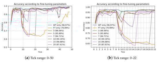 As can be observed in the graph, there are some dramatic deteriorating points with an accuracy below 90%. When the accuracy was below the expected percentage, it was considered inaccurate, as the system failed to recognize previous images. Thus, a “forgetting problem” is considered to have occurred. For example, 11 ticks with 5 fine-tuning parameters, 40 ticks with 10 fine-tuning parameters, and rates of both points were 0.375 and 0.220, respectively. The forgetting problem does not occur with all points of less than 0.2 rate. When performing fine-tuning, it has been verified experimentally that full re-training must be conducted with a less than 0.2 rate to prevent the forgetting problem and we applied it to the system. If the rate reaches 0.2, the server will perform full re-training. In the experiment, we also confirmed that as increases, the model becomes much more robust; thus, the training loss for decreases and even if a large number of are newly trained; however, the deterioration of the model performance appears later. As can be observed in the detailed graph in Figure 9b, all accuracy is deteriorated at 9 tick. It means that there are some changes (e.g., product location or illumination) and something happened with the images. However, even at the tick, the accuracy at 7 fine-tuning parameters is 93.44% and only less than 0.2 rate. We can find out that robustness can be secured by .