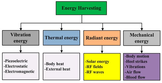 Thermal energy is a source of renewable energy; we are interested in the energy on the micro-level, i.e., the thermal energy of sun waves, and heat energy of the human body, etc. [12]. It is one of the most environmentally friendly forms of energy. Radiant energy is a form of energy that travels by particles or waves; the most common examples are electromagnetic radiations, such as X-rays and heat emitted from the campfire, heat of the microwave, gamma rays, electricity, etc. [13]. In electromagnetic energy harvesting, the maximum power transfer to the load depends upon the inductance, and this inductance could be used to tune resonance to get the peak power [14]. However, in this energy harvesting, it is difficult to get the maximum power when nonlinearities are added into the system [15]. The main application of this technology is in telecommunication, radiometry, lighting, and heating. Radiant heat transmission is deadly [16]. The electromagnetic radiation of fire can kill or injure a passersby, or can cause the combustion material to catch on fire [17]. On the other hand, the kinetic and potential energies are the mechanical energy of an object. Few examples of kinetic mechanical energy are energy produced by light waves, the energy produced by electricity, and energy produced by sound waves [18,19,20]. The main disadvantage of mechanical energy is its safety issues and difficulty to transmit energy over long distances [21].