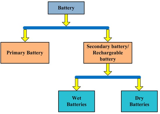 Nowadays, batteries are commonly used in our daily life in most microelectronic and electrical devices; a few examples are cellular phones, clocks, laptops, computers, and toy cars [49,50,51]. Figure 4 shows the classification of various types of batteries. The electrical energy that is generated by different sources and techniques is stored in batteries, by chemical reaction. This energy can be converted back into electrical energy at any time. Conventional batteries are made up of two chemical metals, which form positive and negative electrodes. These are separated by a chemical medium called electrolyte. When an electrical circuit is connected between the battery terminals, due to an electrolytic chemical reaction, the positively charged ions start moving towards the cathode from the electrode, through the electrolyte. At the same time, the negatively charged ions move to the cathode, but the electrolyte creates a blockage and sends the current to the external electronic circuit [52,53]. The battery performance can be indicated by the following two indices: power density (maximum output power) and energy density (how much energy a battery stores). For example, in low-cost electrical devices, the energy storage capacity of the battery defines the operating timeline of that device. In modern batteries, nanomaterials are also used for the coating of the electrodes. When the battery is not in use, these nanomaterials separate the battery electrodes from liquid, which causes low discharging of the battery. Different types of nanomaterials are used, including carbon-coated silicon nanowires, carbon-nano tubes, etc. The main disadvantage of these materials is their low density, which causes high antiparticle resistance, and, as a result, the electrical conductivity of the battery is reduced. These materials also increase the cost of the batteries.