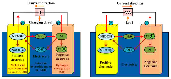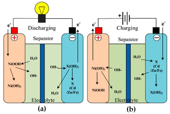 There are the following two types of batteries: primary and secondary. Primary batteries are for one-time application, as they have irreversible chemical reactions [54,55]. The price of these batteries is low and their application is simple for low-power devices. A few examples are as follows: zinc–carbon and zinc manganese alkaline batteries [56]. The specific applications are watches and torches. On the other hand, the application of secondary batteries is multiple times, as they are chargeable. Industries and automobiles are the main application of these batteries, where the value of the initial current should be high. However, the cost and the maintenance are the main disadvantages. The charging and discharging of the nickel battery is explained in detail, with the help of Figure 5. At the time of charge/discharge, the formation of Ni(OH)2, Fe/Cd/Zn(OH)2, and M occurs [57]. In the case of electric vehicles, (a) zinc and (b) nickel–iron batteries are not preferred, because of (a) their low specific power, (b) high cost, (c) low life cycle, and (d) maintenance requirement. On the other hand, the advantage of these two batteries is the 75% energy efficiency.