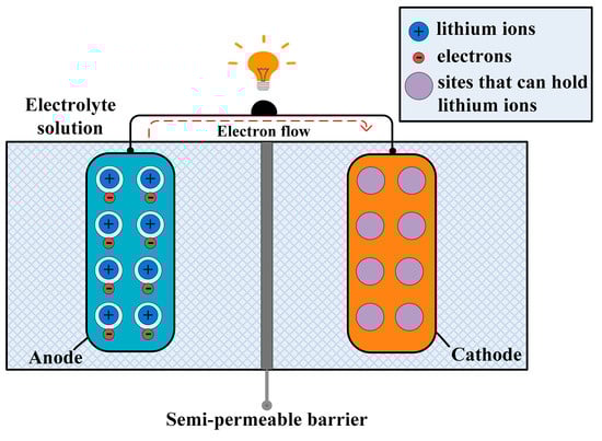 The biggest market for batteries is EV, WSNs, and low-cost microelectronic devices, and now technologies are focusing towards the main challenges of reducing the cost of batteries and increasing the range under electric power [71]. Still, LIBs are the most attractive and best option for commercial use. The energy density of these batteries has increased almost four times since 1991 [72]. According to [73], the biggest drawback of LIBs is the requirement of non-aqueous/organic liquid electrolyte for ionic transfer. The different issues that these batteries are facing are as follows: aging, capacity fading, and safety concerns. According to [74], the safety concern rose with the burning incidents of lithium batteries, and the flammability of the solvents. Due to safety concerns, the transportation of lithium batteries by passenger-cargo planes is banned. Several analyses were done for lithium-ion batteries [75,76]. For seminal novel battery chemistry and sustainability, the best raw materials, and their combination, is required. In the last few years, the usage of the Earth’s abundant metals as negative electrodes was the hottest issue. At present, LIBs are used in laptops, cell phones, and different portable devices. The requirement of an energy source in low-cost MEH and small batteries for low-power electric devices energy storage, made the development in LIBs so much more important [77]. The cathode, electrode, and electrolyte problems in LIBs could be solved by choice of good materials. When we connect a lithium-ion battery with a device, the positively charged ions move from the anode to cathode, then the cathode becomes positive as compared to the anode, as a result the electrons are attracted towards the cathode, as shown in Figure 6 [78]. The future lithium batteries are lithium–sulfur batteries. The charge holding capacity of lithium–sulfur batteries is more than LIBs. Lithium-ion batteries are very popular in low-cost MEH applications. In low-power applications, they are the best option, e.g., earbuds, earphones, mobiles, laptops, and microelectronic gadgets.