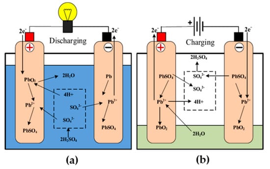 Chemistry of lead acid-based battery, (a) during discharging, (b) during charging [57].