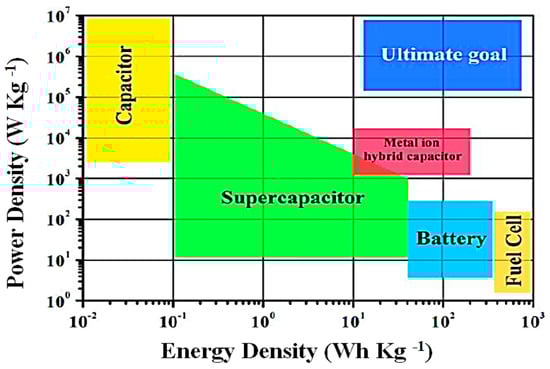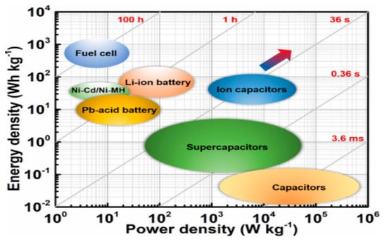 Now, supercapacitors have gained popularity in different energy fields, where constant high energy (toy cars, toy drones) and constant stable energy (computer chips, portable electronic devices and WSNs) are required [118]. The use of supercapacitors is only restricted in backup devices because they cannot store the maximum energy. Supercapacitors form a bridge between batteries and vintage capacitors by overcoming the problems of cell voltage, specific power, and operating cost. The traditional capacitors are preferred, where storage and quick power release is required, and power delivery and liftoff of 196 k Wkg−1 occurs in just a few seconds [119]. On the other hand, supercapacitors have higher specific energy (10.1 Wh/kg) as compared to electrostatic capacitors (6 Wh/kg) [120]. The supercapacitor has alluring features, such as higher values of movement of energy per unit area and a brisk charge/discharge procedure; this is also a reliable constant source of power. In Figure 13, the exchange of power density and energy is described graphically [121].