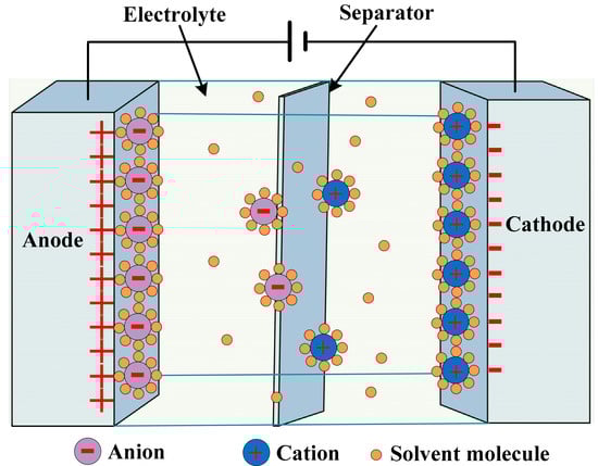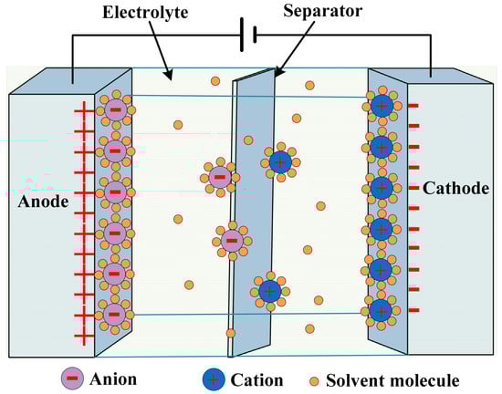 By the application of voltage, the ions in the electrolyte disperse over. The dispersion is in the holes of the opposite electrodes. The charged layers formed due to the disassociation of hundreds of angstroms between the electrodes and electrolyte, as shown in Figure 12 [110,111]. The charge separation is caused by the double-layer capacitance [112]. High capacitance values are achieved, as it increases with increases in the surface area, while it decreases with increases in the distance between the layers.