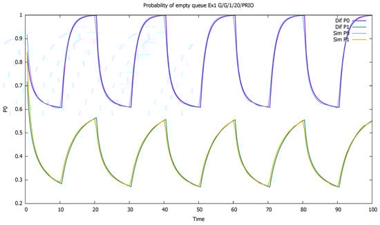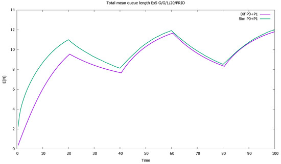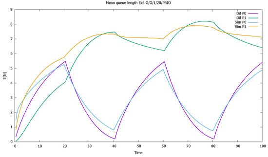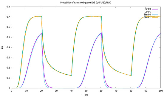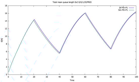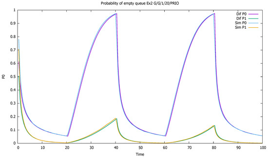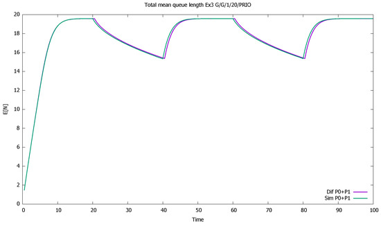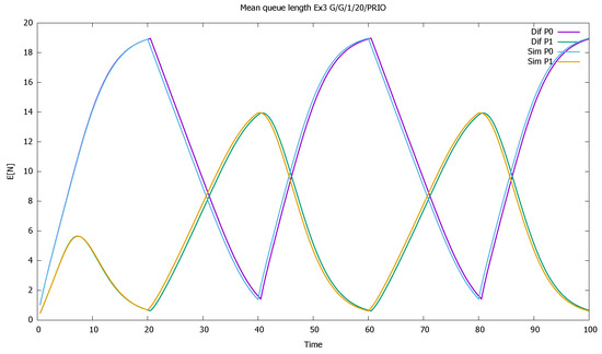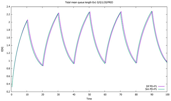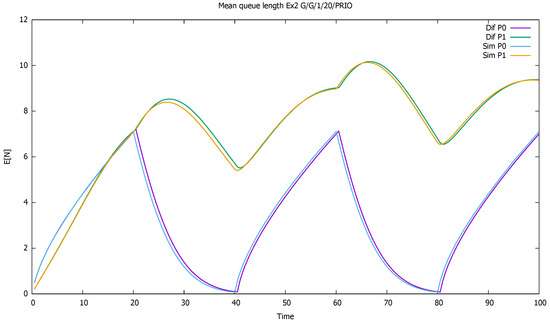 Figure 2 displays the mean number of customers of each class as a function of time. The diffusion and simulation results are compared. We see how when both flows are active, mainly priority customers are served, and the non-priority clients are queued and wait their turn—their queue increases almost linearly. For every 10 time units in which priority customers do not come, they have more chance to enter the service, and their queue empties.