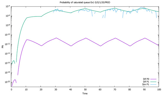Similarly, probabilities and are displayed in Figure 4. As the probability of buffer overflow is weak, we observe that the series of 100,000 simulation runs is not sufficient to determine it properly. No overflow is observed in simulation for the priority class, and the simulation results for the non-priority class are distorted. There is no numerical problems in case of diffusion approximation, even if results are in the order of .
