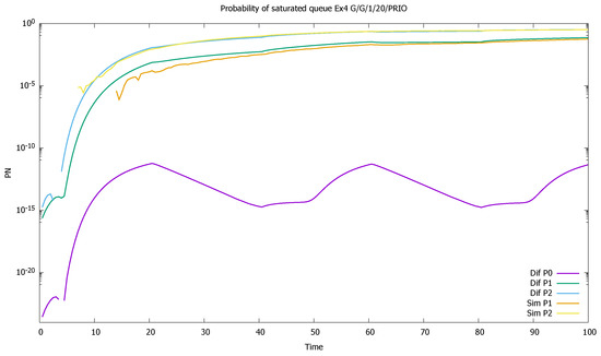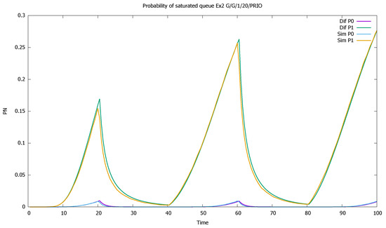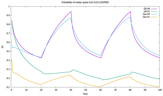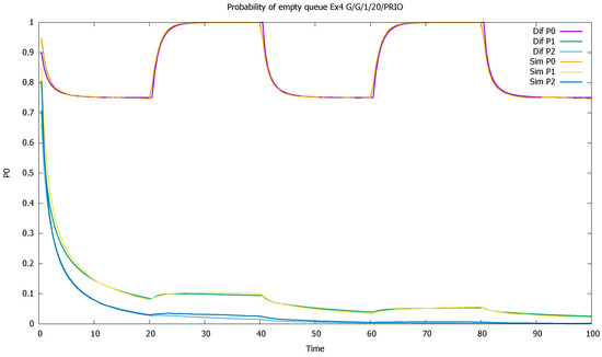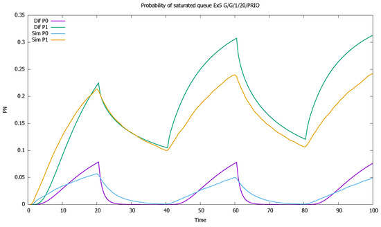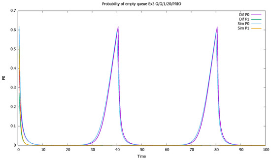 Initially, both queues increase, as shown in Figure 9. After a while, the non-priority queue drops almost to zero because the buffer is monopolized by the higher class. Only when priority customers cease to arrive do lower-priority clients have a chance to enter the buffer, and their queue increases. Therefor the cycles of queue changes are interleaved: when the priority queue increases, the non-priority queue decreases, and vice-versa. There is not space enough in the buffer for both classes; Figure 10 shows that for most of the time, it is full or almost full. The system remains stable due to massive losses; see probabilities of the empty queue in Figure 11 and Figure 12. The probability that the priority queue is full reaches its maximum at the ends of the customer arrival cycles and then decreases. Only at these moments do the lower-class clients see that the queue may be available.