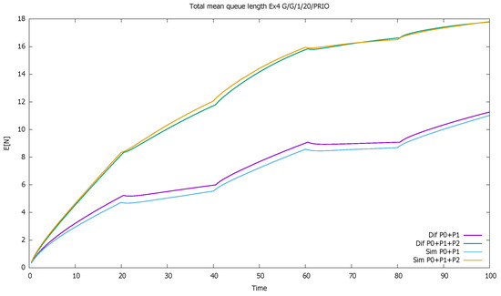 Diffusion approximation remains a heuristic approach, and we do not know strict bounds on its errors; therefore, we should check its quality in various cases. The errors of the method in case of FIFO queue as presented in Section 2.1 were discussed, e.g., in [46,51]. Below, we investigate the quality of the diffusion priority model, considering a few numerical examples differing in the number of priorities, input intensities, and type of interarrival and service time distributions.
