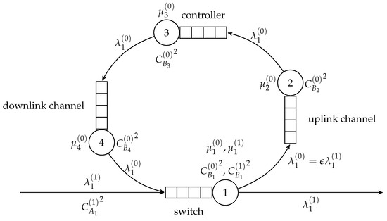 Queueing theory has supported the process of design and performance evaluation of communication systems since the beginning of telephony and telegraphy, that is, since the times of Erlang and Engset. It has great potential to be used in investigations in problems mentioned above and has already been applied in some analyses of SDN performance. The models used until now are mainly elementary queueing systems, i.e., M/M/1 stations with Poisson arrivals and exponential service time distribution, representing switches and controllers, e.g., in [24] Jackson’s network model, an open network of M/M/1 queues is used for this purpose. Furthermore, Reference [25] presents a tool for SDN network visualization and performance prediction based on M/M/1 models and shows its results with the use of actual data. In [26], a queueing model is refined by the use M/Geo/1 model where service times are geometrically distributed. A more general model of switch and controller is presented in [27,28]. It is based on a preemption-based packet-scheduling priority scheme where a higher priority is assigned to packets routed to switch from the controller. The solution is approximative; the authors present a method to decompose the system with priority and non-priority queues into two systems with one type of queue. In [29], a Markov model of the switch with preemptive priority and non-priority queues and controller, based on a Markov chain, is presented. The interarrival time distribution is composed of multiple phases, so the model is close to the G/M/1/N station. A similar model with general input and non-preemptive priority was proposed in [30]. A recent article [31] presents a model where the switch is represented by three M/M/n/m stations in series, and the controller is modeled by two similar stations, representing the modules of both devices—switch and controller exchange packets with fixed probabilities. A few other models were based on deterministic or stochastic network calculus [32,33,34].